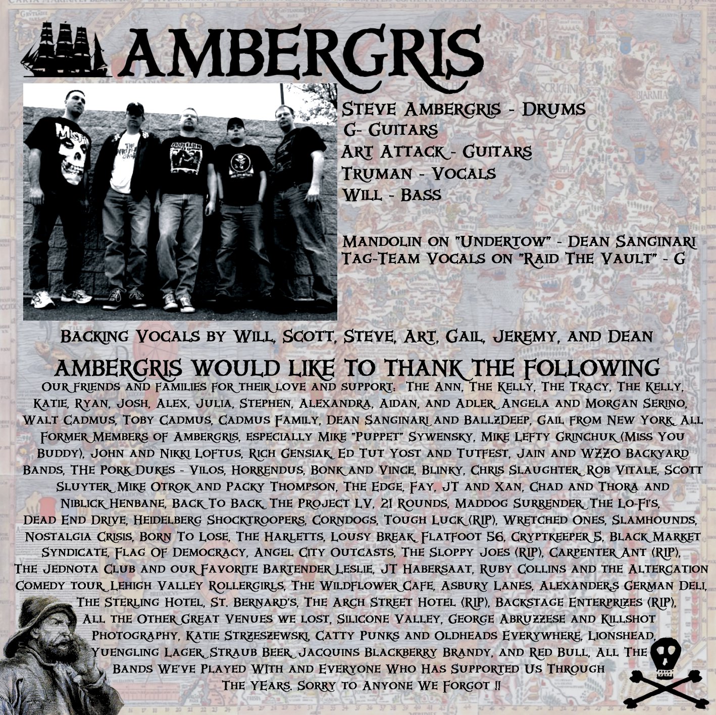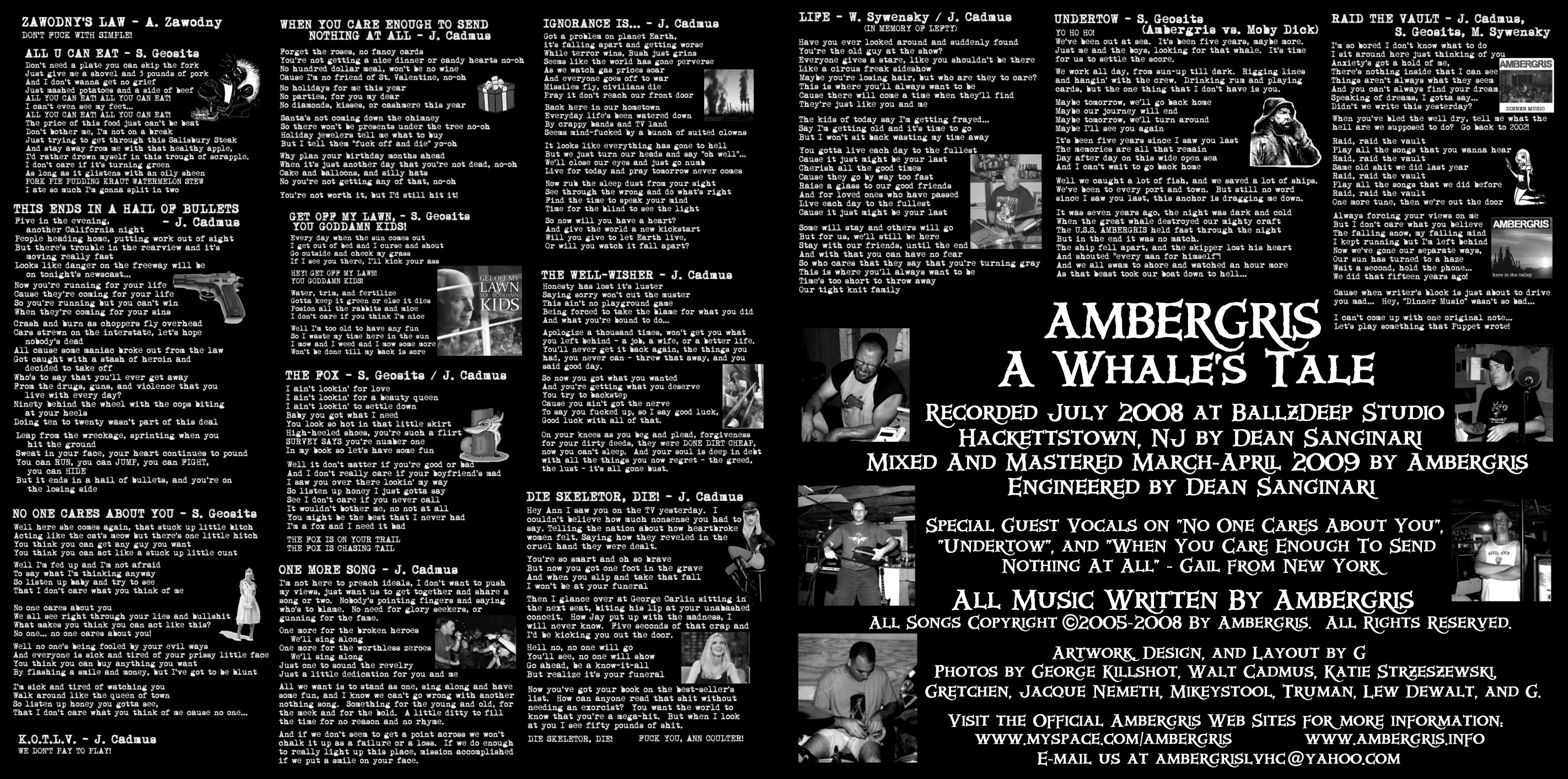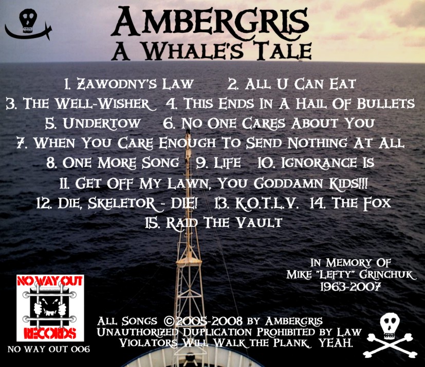 A Whale’s Tale was Ambergris’ second full-length CD released on June 13, 2009. It represents the culmination of three long years of writing new material. The songwriting has improved and some of the bands best efforts are showcased on this disc. Despite the quality of the songs, overall dissatisfaction with the mix led to a short lifespan and to several of the tracks being re-recorded on 2010’s “This Blows” EP.