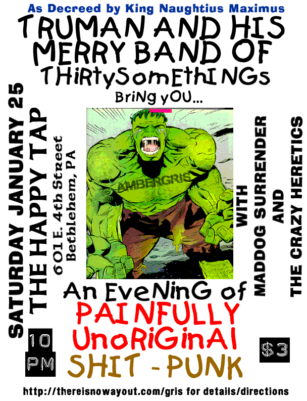 - 1/25/2003 – w/ Maddog Surrender, The Crazy Heretics – The Happy Tap, Bethlehem PA flyer 2 flyer 3