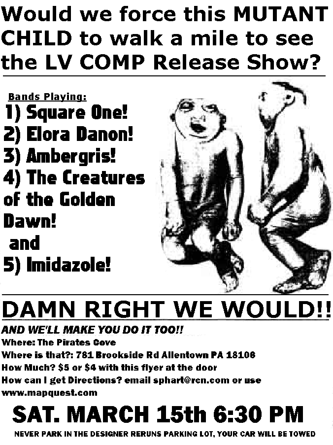 - 3/15/2003 – Lehigh Valley Compilation CD Release Party – w/ Square One, Elora Danon, Creatures of The Golden Dawn, Imidazole – The Pirates Cove, Wescosville PA