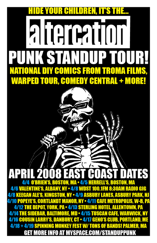 - 4/13/2008 – Altercation Punk Standup Tour w/ Toxic Sunshines, Corndogs, Tough Luck, The Blame, F-Bombers – The Sterling Hotel, Allentown PA