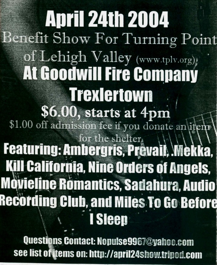 - 4/24/2004 – Turning Point of the Lehigh Valley Benefit Show w/ .Mekka, Miles To Go Before I Sleep, Kill California, Movieline Romantics, Nine Orders of Angels, Audio Recording Club, Sadaharu, Prevail – Trexlertown Fire Company, Trexlertown PA