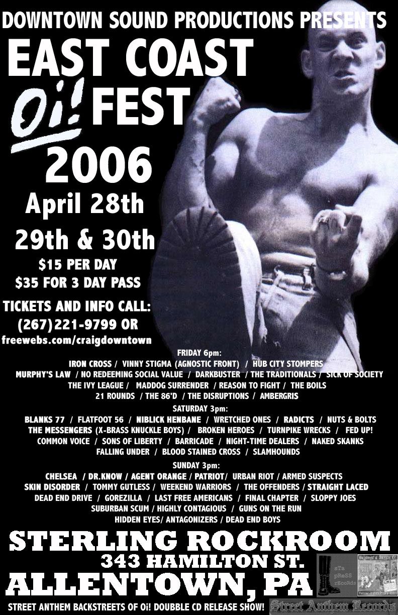 - 4/28/2006 – East Coast OiFEST w/ 21 Rounds, Maddog Surrender, The Project, Murphy’s Law, Brunt Of It, Hub City Stompers, The Ivy League, In Search Of…, Sick Of Society, Highly Contagious, Reason To Fight, The 86’ed, The Disruptions – The Sterling Hotel, Allentown PA