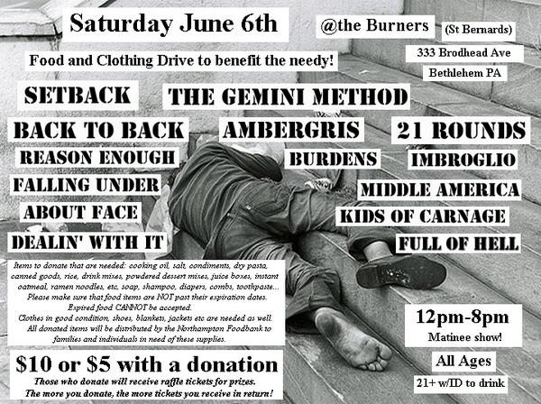 - 6/6/2009 – Northampton Food Bank Benefit Show w/ Setback, The Gemini Method, Back To Back, 21 Rounds, Reason Enough, Burdens, Imbroglio, Falling Under, Middle America, About Face, Kids Of Carnage, Dealin’ With It, Full Of Hell – St. Bernard’s, Bethlehem PA