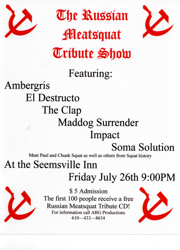 - 7/26/2002 – Russian Meatsquats Tribute Show w/ The Clap, Soma Solution, El Destructo, Maddog Surrender, Impact – The Seemsville Inn, Seemsville PA flyer 2