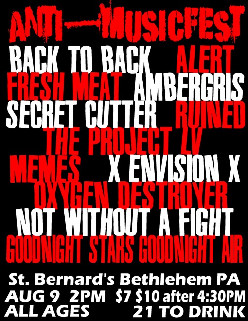 - 8/9/2009 – ANTI-MUSICFEST w/ The Project LV, Back To Back, Fresh Meat, Goodnight Stars Goodnight Air, Secret Cutter, Ruined, Memes, Oxygen Destroyer, Alert!, XenvisionX – St. Bernard’s, Bethlehem PA
