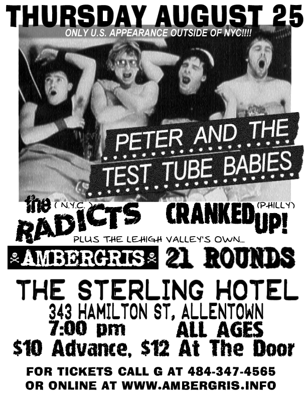 - 8/25/2005 – w/ Peter and the Test Tube Babies, The Radicts City, Cranked Up!, 21 Rounds – The Sterling Hotel, Allentown PA