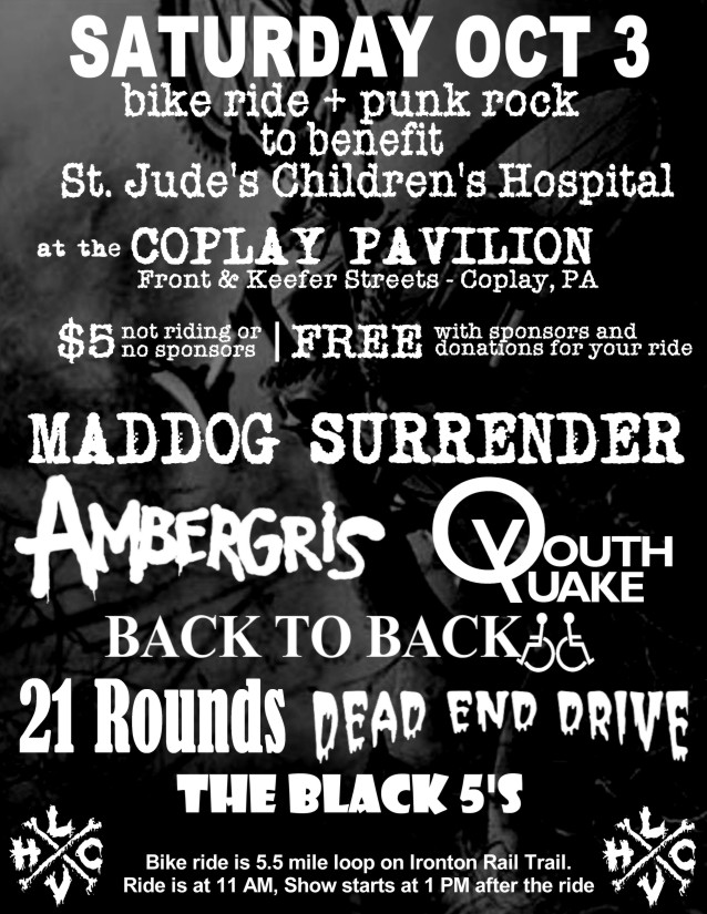 - 10/3/2009 – St. Jude’s Children’s Hospital BIKE BENEFIT w/ On Trial, 21 Rounds, Dead End Drive, Maddog Surrender, Youth Quake – Coplay Pavilion, Coplay PA