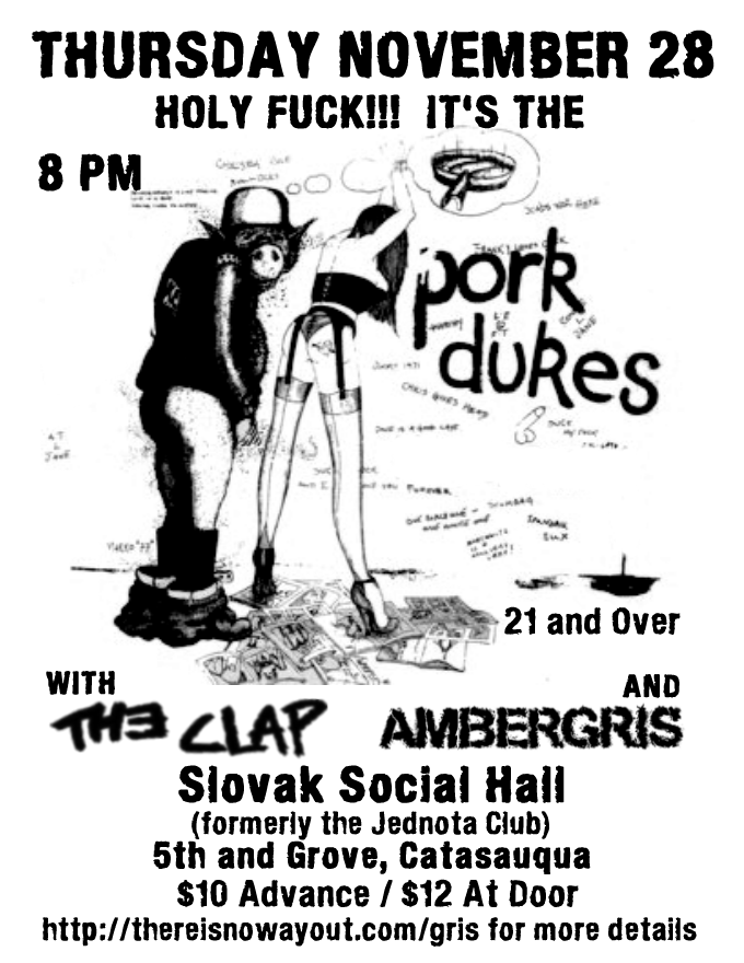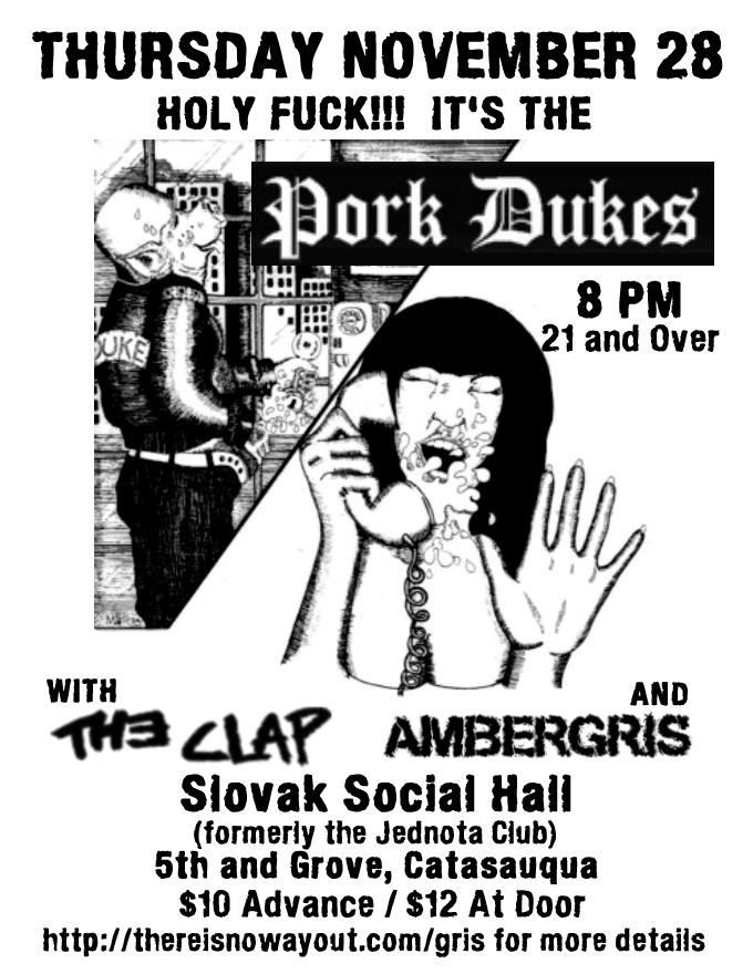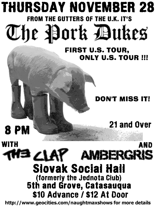 - 11/28/2002 – w/ Pork Dukes, The Clap, Slamhounds – The Jednota Club, Catasauqua PA flyer 2 flyer 3 flyer 4 flyer 5 flyer mini