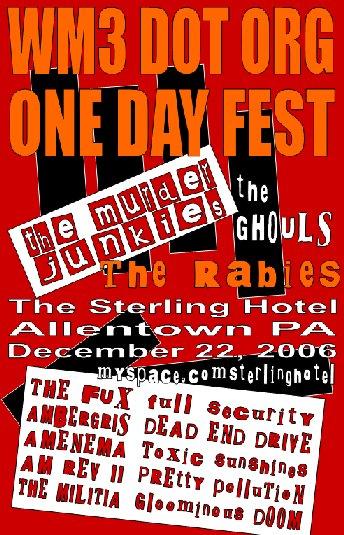 - 12/22/2006 – Benefit for the West Memphis 3 w/ Murder Junkies, The Ghouls, The Rabies, Dead End Drive, Common Voice, The FUX, The Militia, Gloominous Doom, Amenema, Pretty Pollution, Toxic Sunshines, Full Security – The Sterling Hotel, Allentown PA band-order1 band-order2