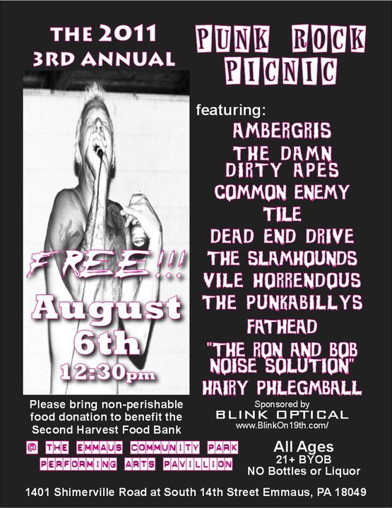 - 8/6/2011 – Lehigh Valley Punk Rock Picnic III w/ The Damn Dirty Apes, Common Enemy, Tile, Dead End Drive, Slamhounds, Vile Horrendous, Fathead, The Punkabillys, Maestro Please, Hairy Phlegmball, Slums – Emmaus Community Park, Emmaus PA