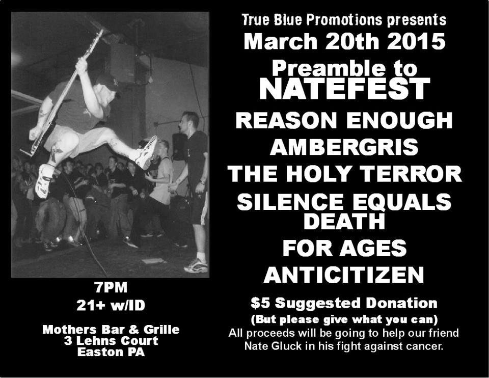 - 3/20/2015 – Natefest Preamble w/ Reason Enough, The Holy Terror, Silence Equals Death, For Ages, Anticitizen – Mother’s Bar and Grille, Easton PA