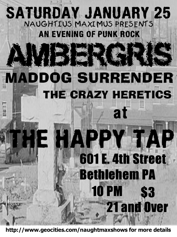 - 1/25/2003 – w/ Maddog Surrender, The Crazy Heretics – The Happy Tap, Bethlehem PA flyer 2 flyer 3