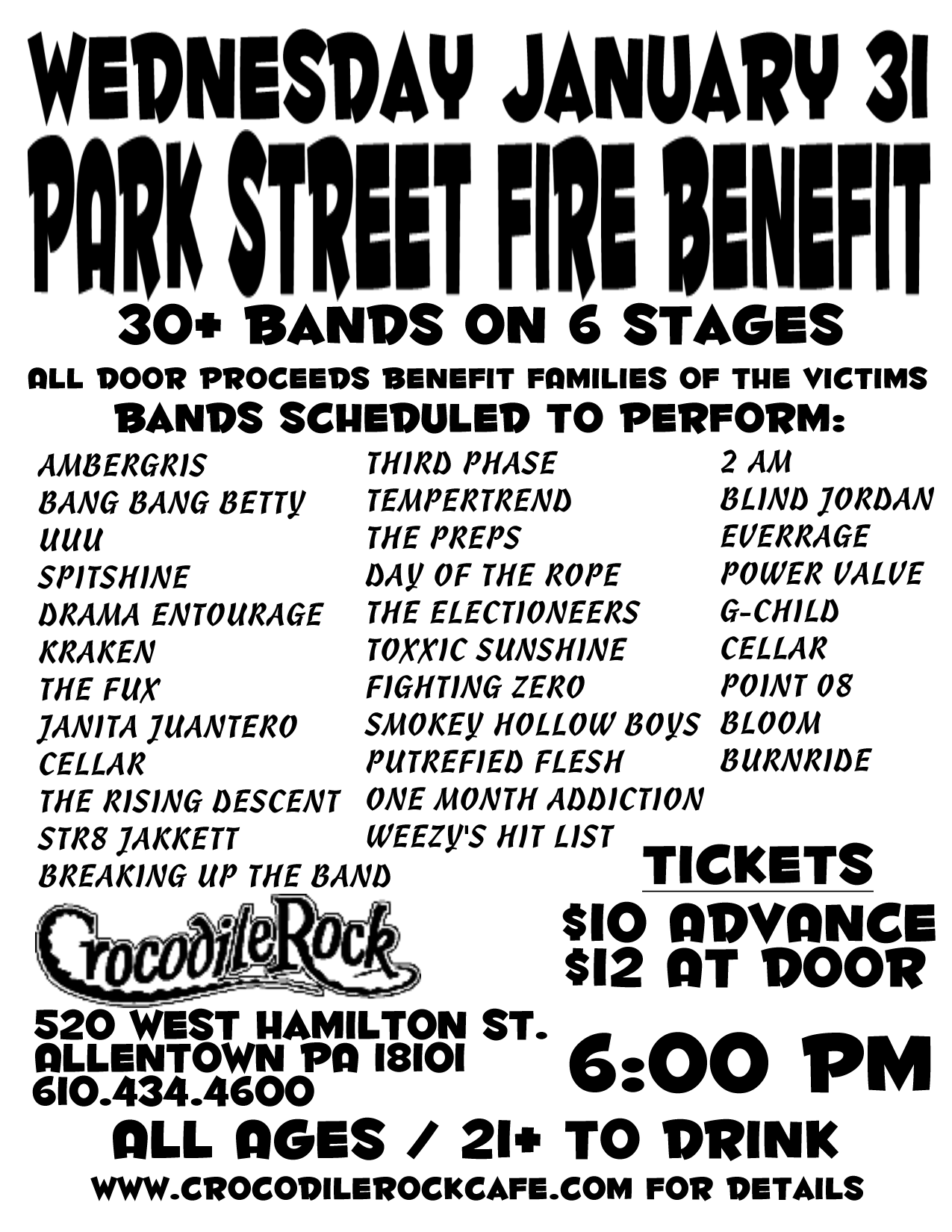 - 1/31/2007 – PARK STREET FIRE VICTIMS BENEFIT – 34 bands on 4 stages – Crocodile Rock, Allentown PA