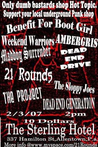 - 2/3/2007 – BOOTGIRL BENEFIT w/ Weekend Warriors, The Project LV, Maddog Surrender, 21 Rounds, Dead End Drive, Dead End Generation, The Sloppy Joes, The FUX – The Sterling Hotel, Allentown PA