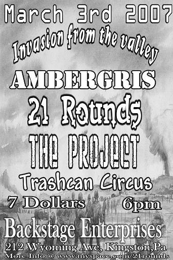 - 3/3/2007 – w/ 21 Rounds, The Project LV, Trashcan Circus – Backstage Enterprises, Kingston PA