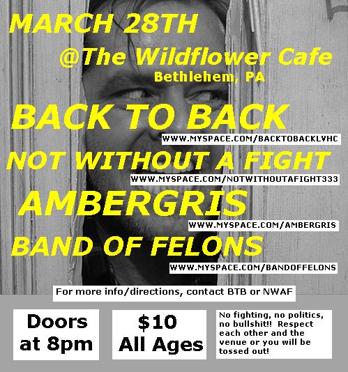 - 3/28/2008 – w/ Back To Back, Not Without A Fight, Band Of Felons – Wildflower Cafe, Bethlehem PA