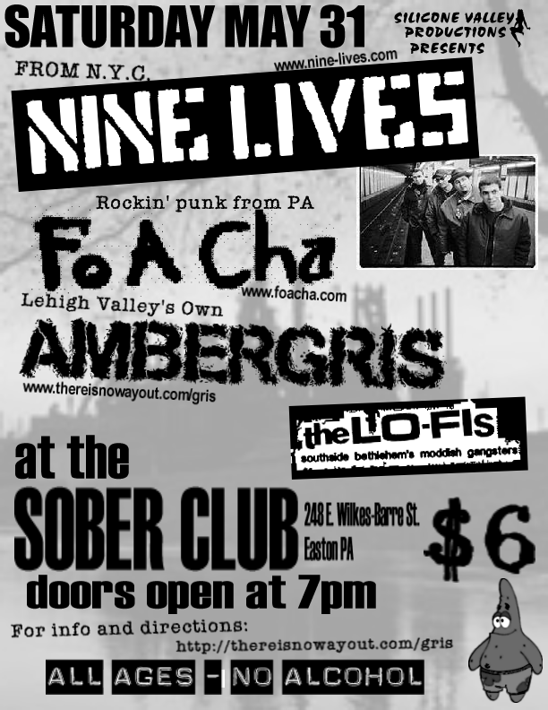 - 5/31/2003 – w/ Nine Lives, Fo A Cha, The Lo-Fi’s – The Sober Club, Easton PA
