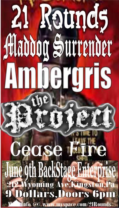 - 6/9/2007 – w/ Cease Fire, The Project LV, Maddog Surrender, 21 Rounds – Backstage Enterprises, Kingston PA