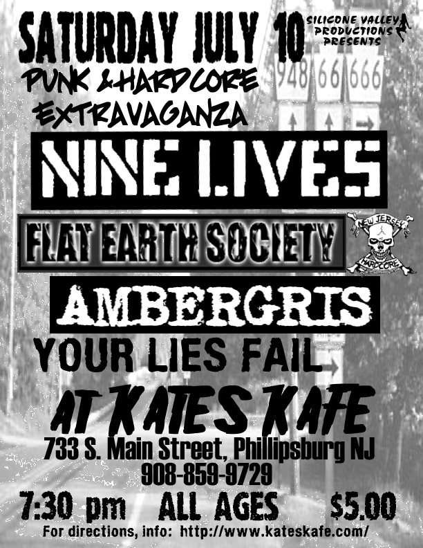 - 7/10/2004 – w/ Nine Lives, Flat Earth Society, Your Lies Fail – Kate’s Kafe, Phillipsburg NJ – ART’S FIRST SHOW