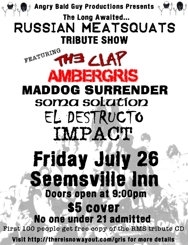 - 7/26/2002 – Russian Meatsquats Tribute Show w/ The Clap, Soma Solution, El Destructo, Maddog Surrender, Impact – The Seemsville Inn, Seemsville PA flyer 2