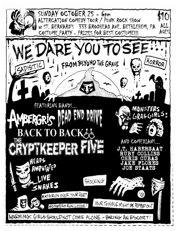- 10/25/2009 – Altercation Comedy Tour w/ Back To Back, Dead End Drive, The Cryptkeeper Five – St. Bernard’s, Bethlehem PA