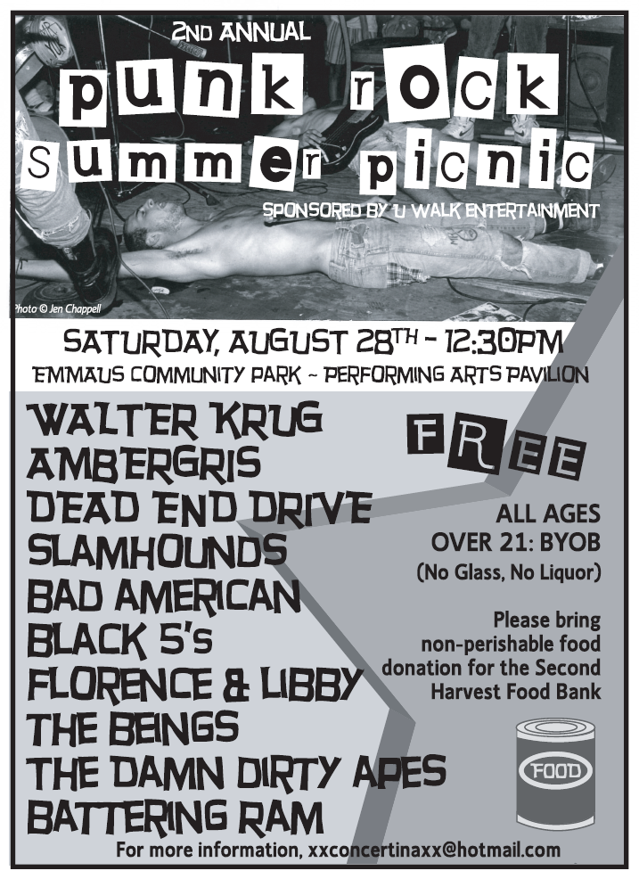 - 8/28/2010 – Lehigh Valley Punk Rock Picnic II w/ Walter Krug, Dead End Drive, Slamhounds, Bad American, Black 5’s, Florence And Libby, The Beings, The Damn Dirty Apes, Battering Ram – Emmaus Community Park, Emmaus PA
