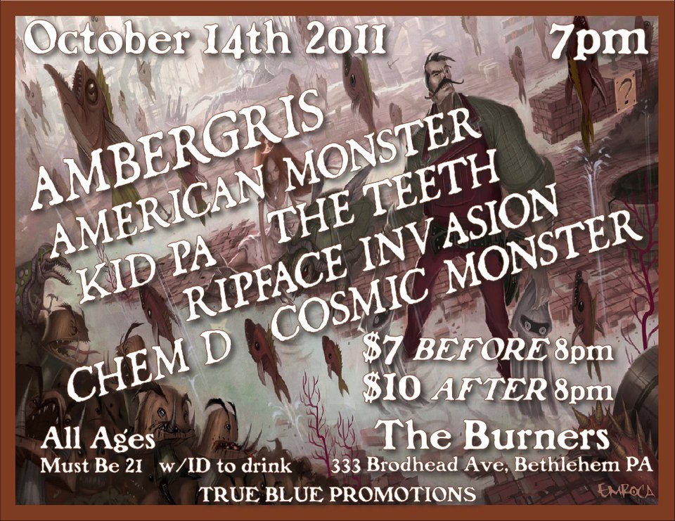 - 10/14/2011 – w/ American Monster, Kid PA, The Teeth, Ripface Invasion, Chem D, Cosmic Monster – St. Bernard’s, Bethlehem PA